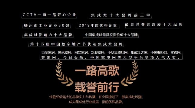 承載榮譽(yù),再攀高峰。2020年佳歌集成灶將繼續(xù)秉承創(chuàng)新、整合、服務(wù)、共贏的經(jīng)營(yíng)理念,通過全體佳歌人的不懈努力,立志為廣大消費(fèi)者打造智能無煙廚房,期望與社會(huì)各界人士攜手共創(chuàng)更加美好燦爛的明天!
