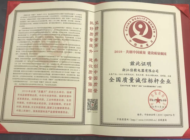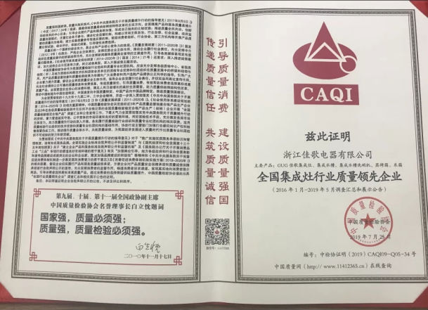 憑借著過硬的產(chǎn)品質(zhì)量及服務(wù)質(zhì)量,佳歌集成灶被中國(guó)質(zhì)量檢驗(yàn)協(xié)會(huì)評(píng)為“全國(guó)集成灶行業(yè)質(zhì)量領(lǐng)先企業(yè)”和“全國(guó)質(zhì)量誠(chéng)信標(biāo)桿企業(yè)”,體現(xiàn)了權(quán)威機(jī)構(gòu)對(duì)佳歌集成灶產(chǎn)品品質(zhì)和服務(wù)的認(rèn)可。