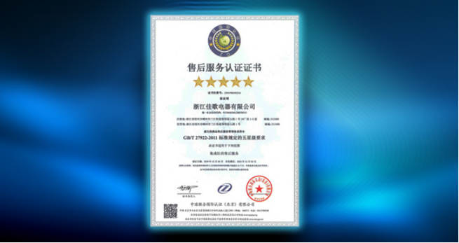 經(jīng)權(quán)威機(jī)構(gòu)認(rèn)證,佳歌集成灶達(dá)到國(guó)家標(biāo)準(zhǔn),一舉摘下售后服務(wù)的桂冠——五星級(jí)售后服務(wù)認(rèn)證。通過認(rèn)證意味著佳歌集成灶擁有完善的服務(wù)體系并得到良好運(yùn)轉(zhuǎn);意味著佳歌在全國(guó)和全行業(yè)中服務(wù)領(lǐng)先,在品牌與信譽(yù)上有著極大優(yōu)勢(shì)。