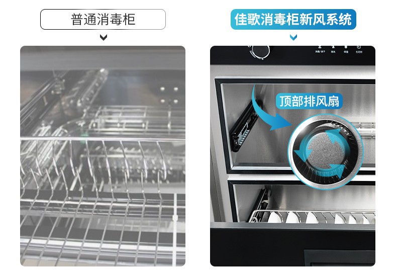 佳歌所有消毒柜款集成灶都搭載有新風(fēng)系統(tǒng)。消毒柜頂部均有配備排風(fēng)扇,消毒烘干結(jié)束自動(dòng)開啟30分鐘排氣,排出柜內(nèi)水蒸氣,消除臭氧異味。讓所有使用者打開柜門永遠(yuǎn)都是清新空氣。