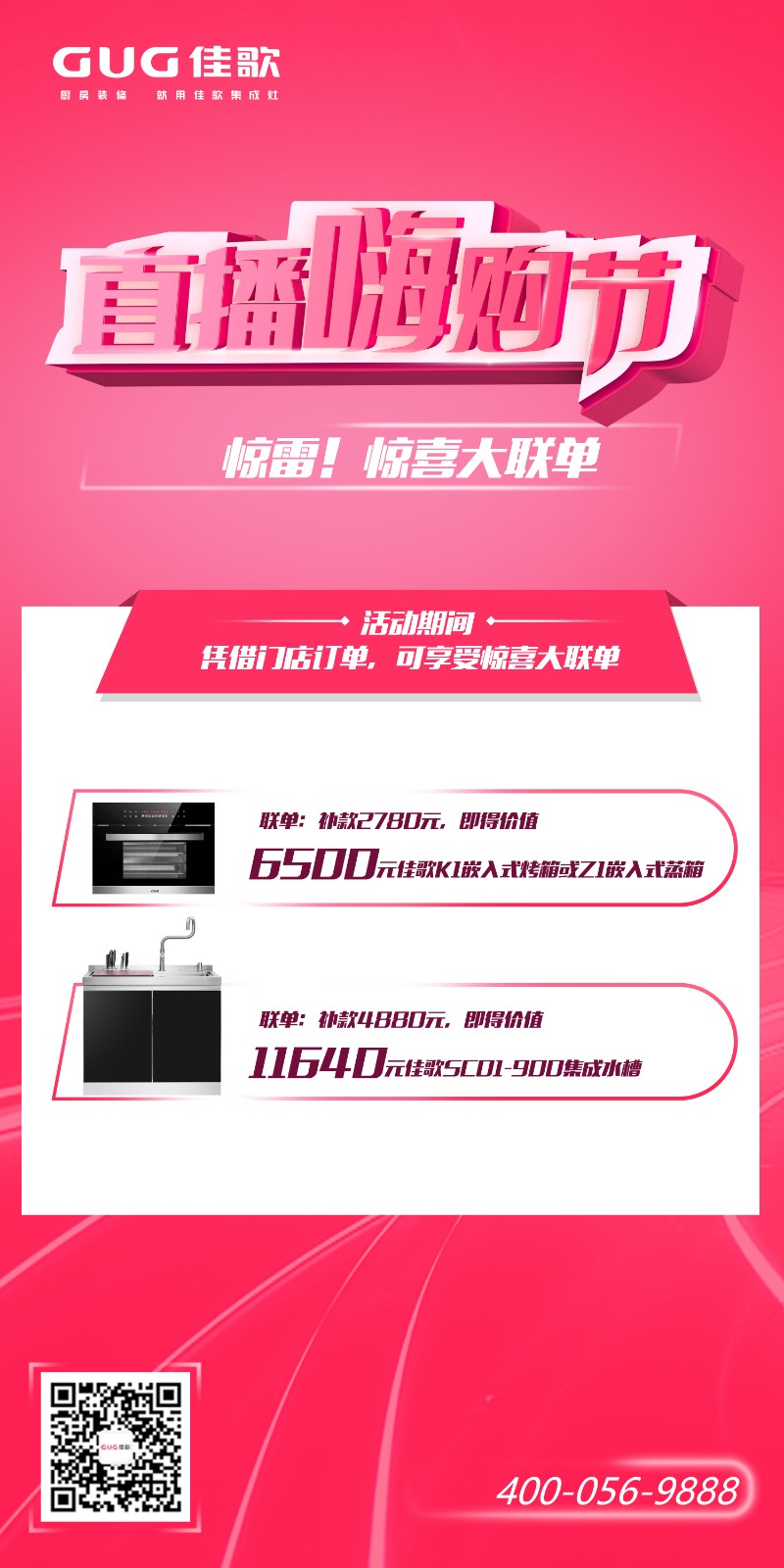 活動(dòng)期間憑借門店訂單,還可享受驚喜大聯(lián)單:補(bǔ)款2780元,即得價(jià)值6500元佳歌K1嵌入式烤箱或Z1嵌入式蒸箱;補(bǔ)款4880元,即得價(jià)值11640元佳歌SC01-900集成水槽!一次購買,雙倍超值!