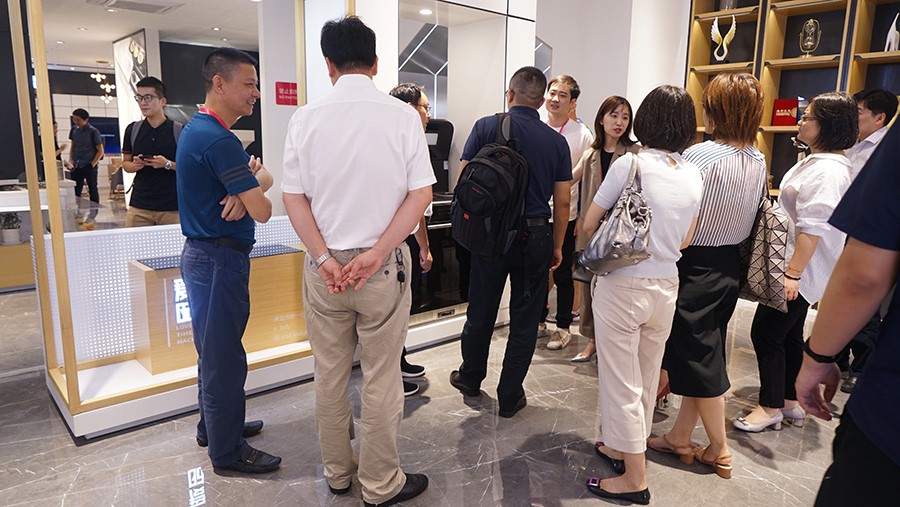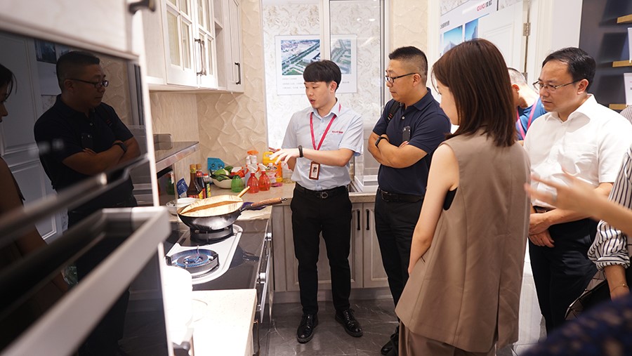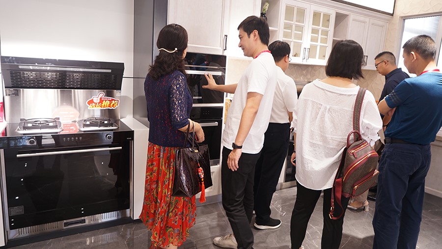 考察團一行來到佳歌集成灶展廳近距離體驗了一把佳歌集成灶的使用感受。佳歌所有產品均出自全球頂尖設計師之手,真正的精雕細琢,整體外觀一體成型,99.96%的凈煙能力,5.0kW超大火力都無一不讓考察團拍手稱贊。